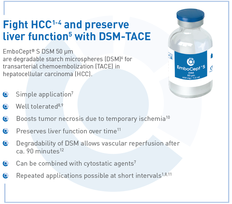 EmboCept® S DSM 50 µm suspension for injection is an adjuvant in the intra-arterial treatment of inoperable liver tumours and lung tumours in combination with cytostatic agents, the aim of which is to optimise the intra-tumoral drug accumulation.
