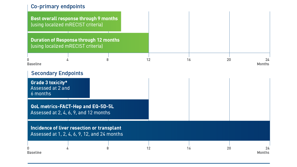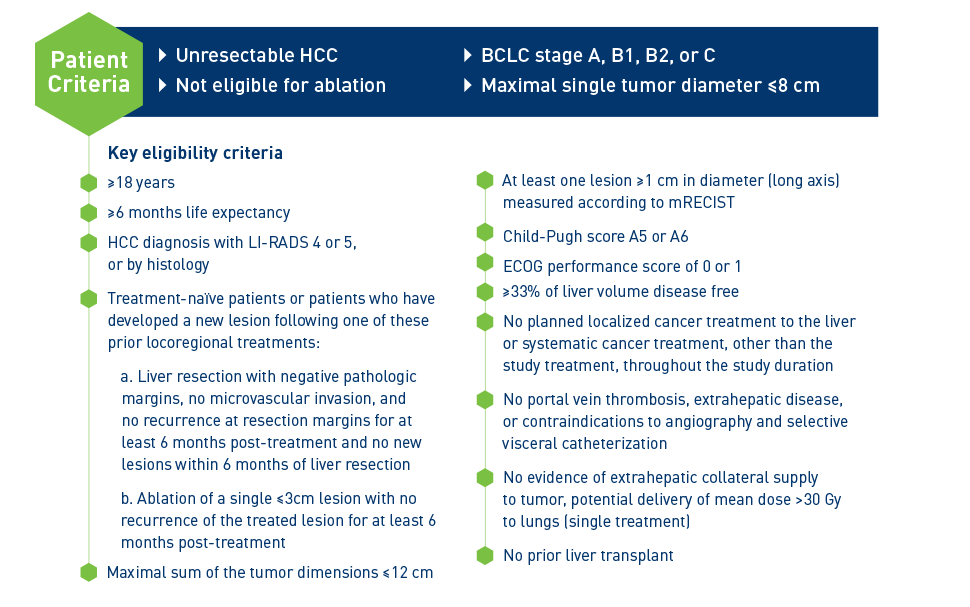 BCLC, Barcelona Clinic Liver Cancer, ECOG, Easter Cooperative Oncology Group; EQ-5D-5L, EuroQoL 5-Dimensions 5-Level; FACT-Hep, Functional Assessment of Cancer Therapy-Hepatobiliary; HCC, hepatocellular carcinoma; LI-RADS, Liver Imaging Reporting And Data System; mRECIST, modified Response Evaluation Criteria in Solid Tumors; QoL, quality of life; SIRT, selective internal radiation therapy.