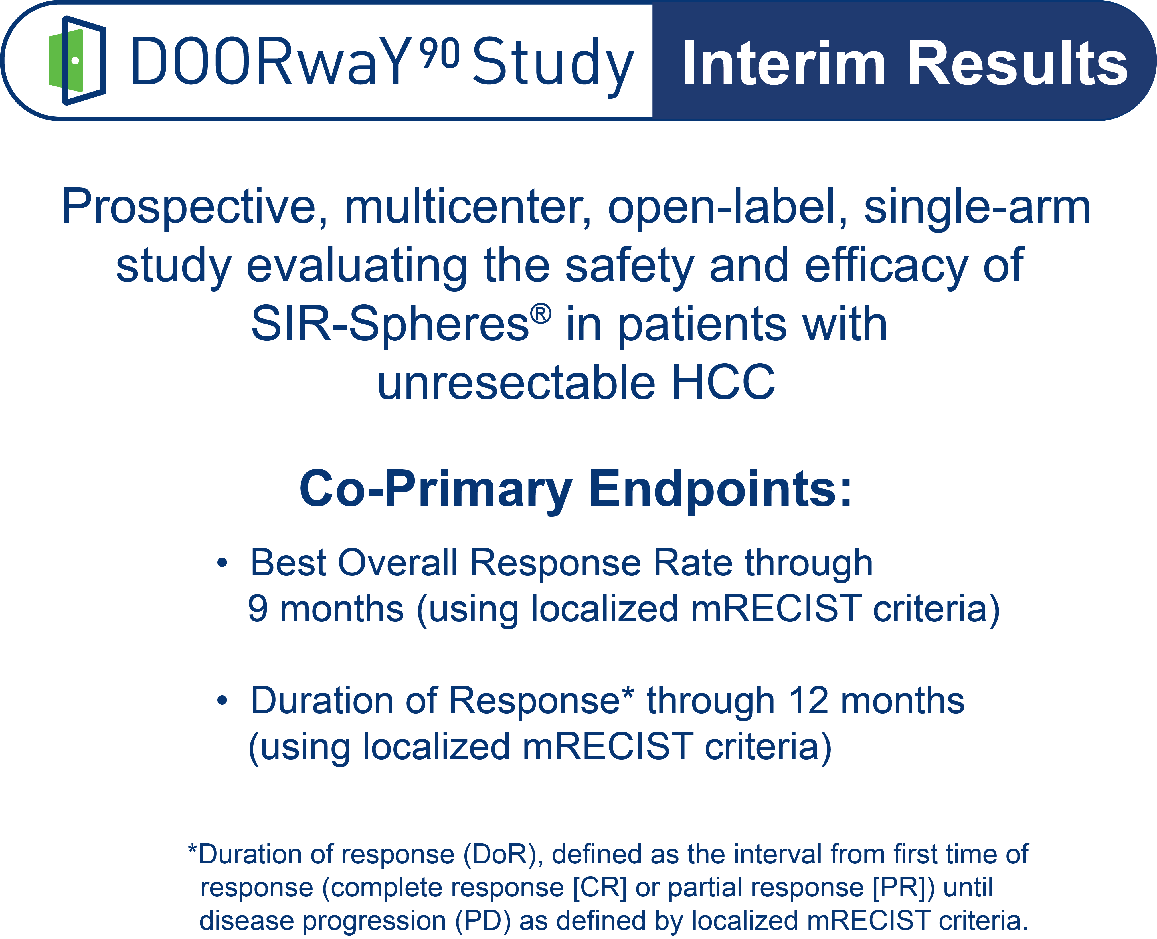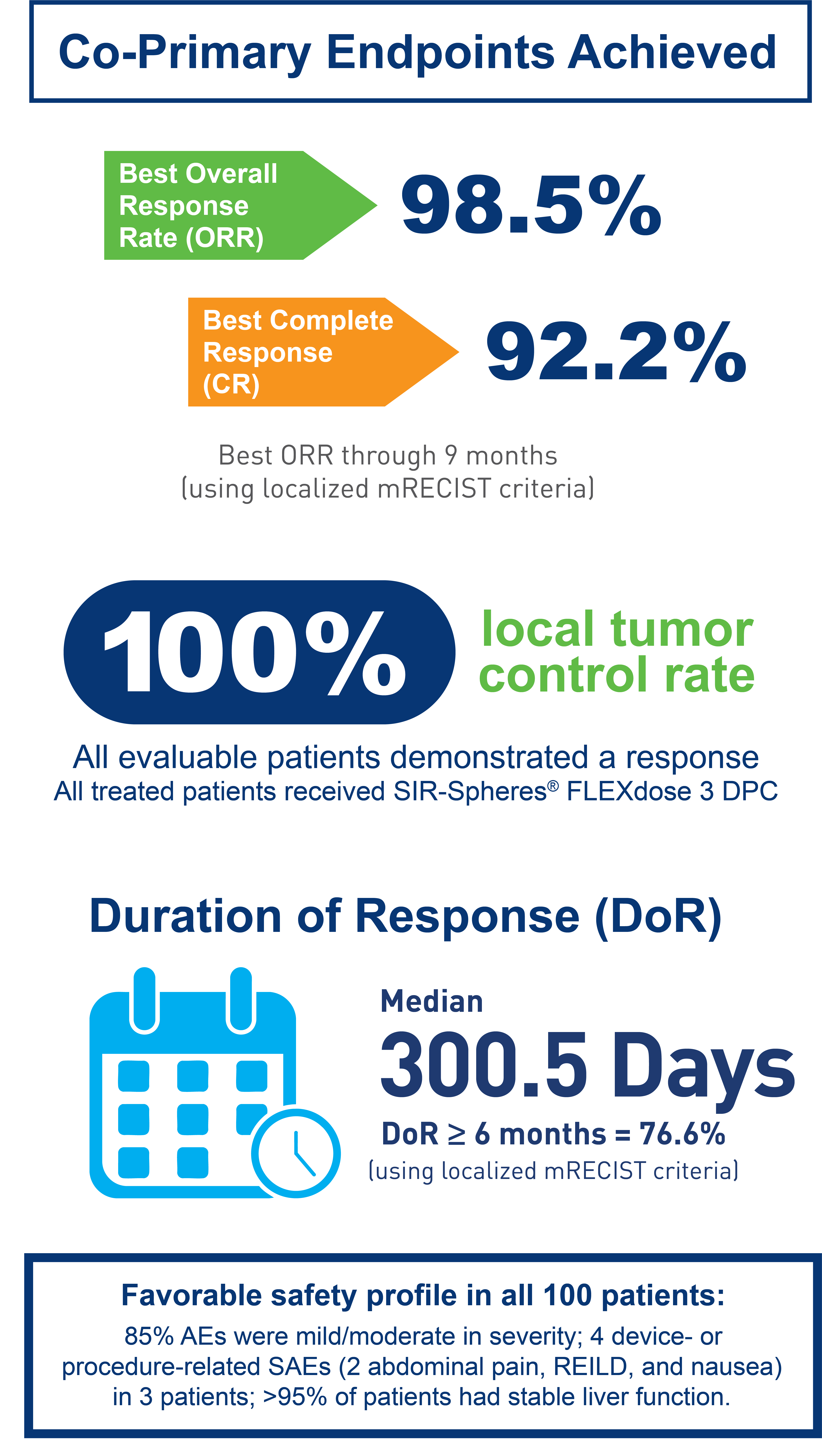 Caution: Federal (USA) law restricts this device to sale by or on the order of a physician Indications for Use: SIR-Spheres® Y-90 resin microspheres are indicated for the local tumor control of unresectable hepatocellular carcinoma (HCC) in patients with no macrovascular invasion, Child Pugh-A cirrhosis, well-compensated liver function, and good performance status. They are also indicated for the treatment of unresectable metastatic liver tumors from primary colorectal cancer with adjuvant intra-hepatic artery chemotherapy (IHAC) of FUDR (Floxuridine). Side Effects: Common side effects are fever, transient decrease of hemoglobin, mild to moderate abnormality of liver function tests, abdominal pain, nausea, vomiting, and diarrhea. Potential serious effects due to exposure to high radiation include acute pancreatitis, radiation pneumonitis, acute gastritis, acute cholecystitis and radioembolization induced liver disease (REILD). Consult the Instructions for Use for a complete listing of indications, contraindications, side effects, warnings, and precautions.